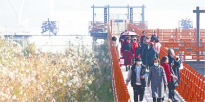市民赶在江滩的芦荻收割前到这里拍照留影。