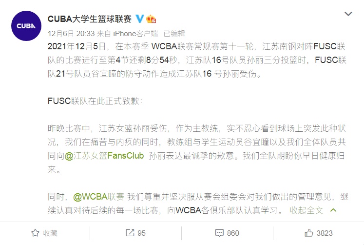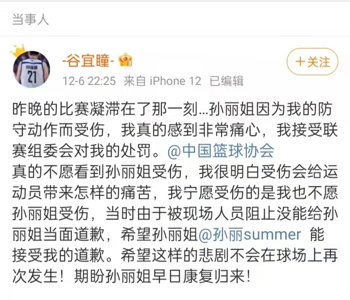 而与此同时,CUBA大学生篮球联赛以及当事人谷宜瞳先后在社交媒体发文致歉,字里行间写下了对于孙丽早日康复的祝福。