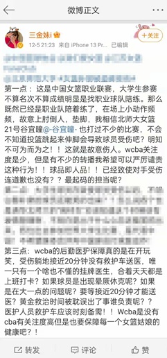 在比赛结束后当晚,江苏女篮队员胡鑫雨在社交媒体写下长文,针对队友受伤一事,她态度强硬地斥责对手违规行为的同时,暗示对手事后没有进行道歉,并对事情发生后联队的一系列反应感到不满,并对救护车没能及时达到现场感到愤怒。