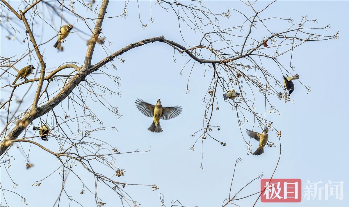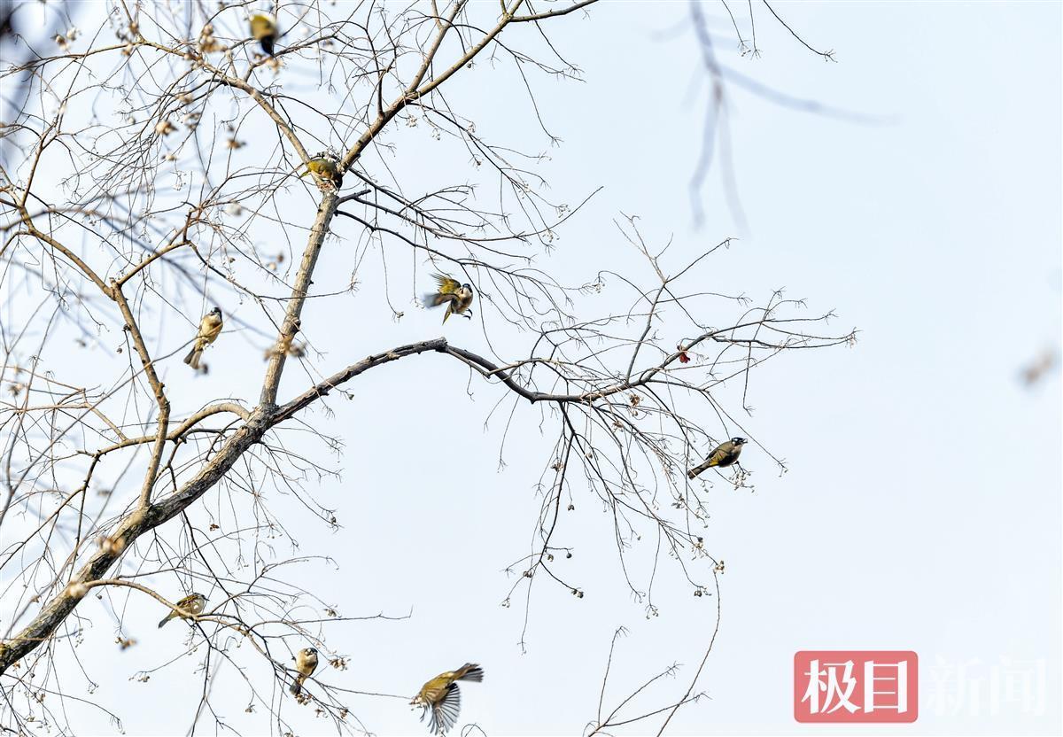 冬日温暖的阳光里,白鹡鸰悠闲地在树下行走,喜鹊在林中漫步、觅食,蜡嘴雀在枝头发呆,远道而来的红嘴鸥在高空飞翔,东湖常客“鸬鹚”越过枝头在湖中聚集,多种小鸟飞聚东湖,各展萌态,以各自的鸟语闹着“冬枝”。