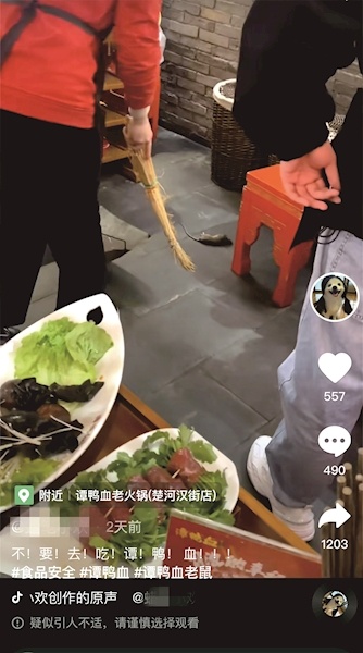 刘女士说,在外就餐多年,还是第一次看到餐厅有老鼠掉下来。此前也听说过,其他城市的谭鸭血门店被食客曝光火锅里有蛆虫。此外,刘女士将视频发布到网上后,不少网友评论,餐厅有老鼠是常事,并不少见。“餐厅出现老鼠,这么严重的食品安全问题,却被不少网友认为习以为常。”这一点令刘女士感到吃惊。
