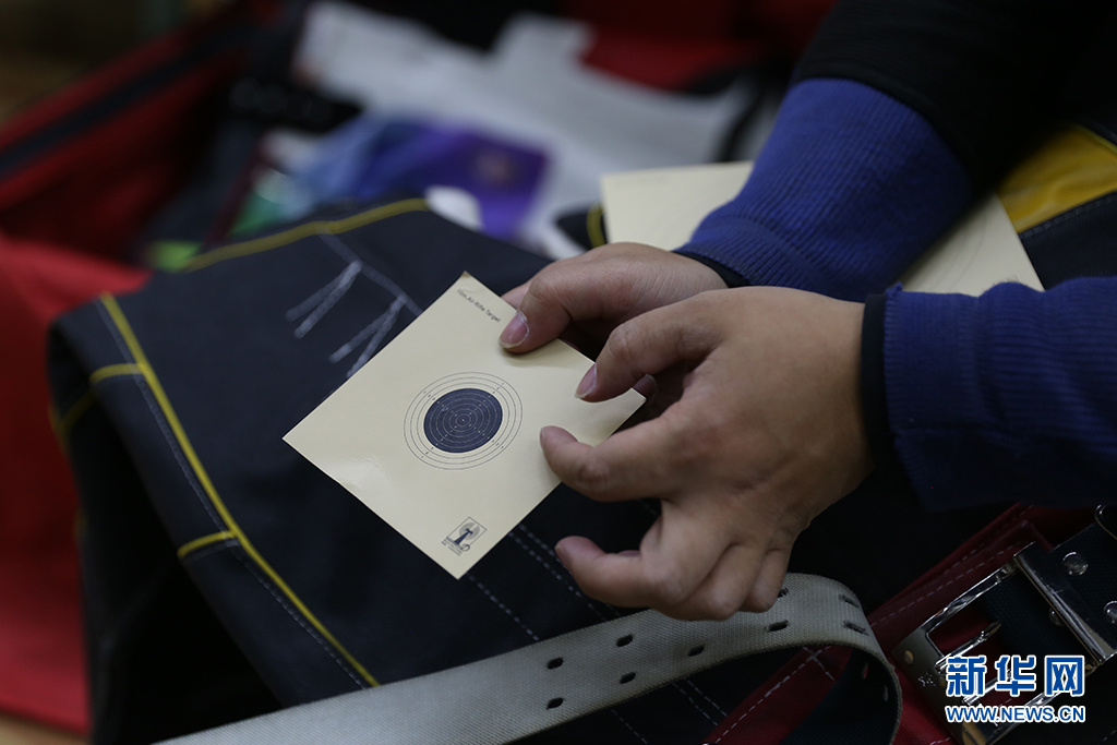 为了防止回弹和跳弹等意外伤人,射击气步枪子弹一般用铅等软金属为主要材质。在集训时,董超每天要射击子弹200发以上。图为董超射击训练时正在往气步枪里放子弹。新华网 张可凡 摄