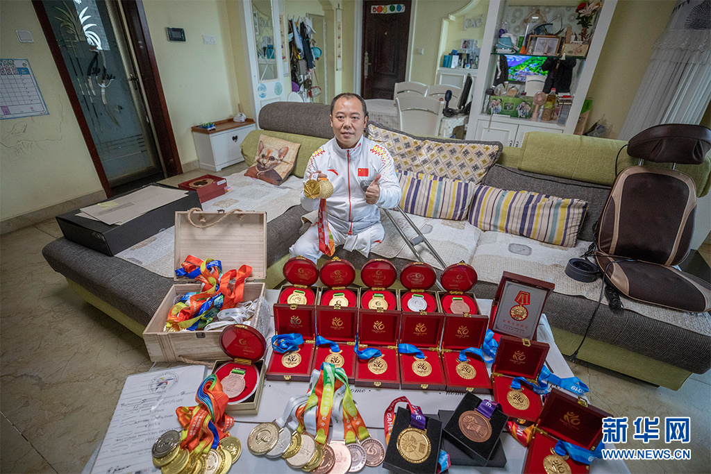 从接触射击项目到现在17年过去了,沉甸甸的103块奖牌是对董超多年坚持最好的回馈。采访时,董超取出装有奖牌的大箱子,让同行记者大为震撼。董超也对每块奖牌如数家珍,一一给记者介绍。图为董超和部分奖牌合影,他手中拿的正是东京残奥会获得的金牌。新华网 张可凡 摄