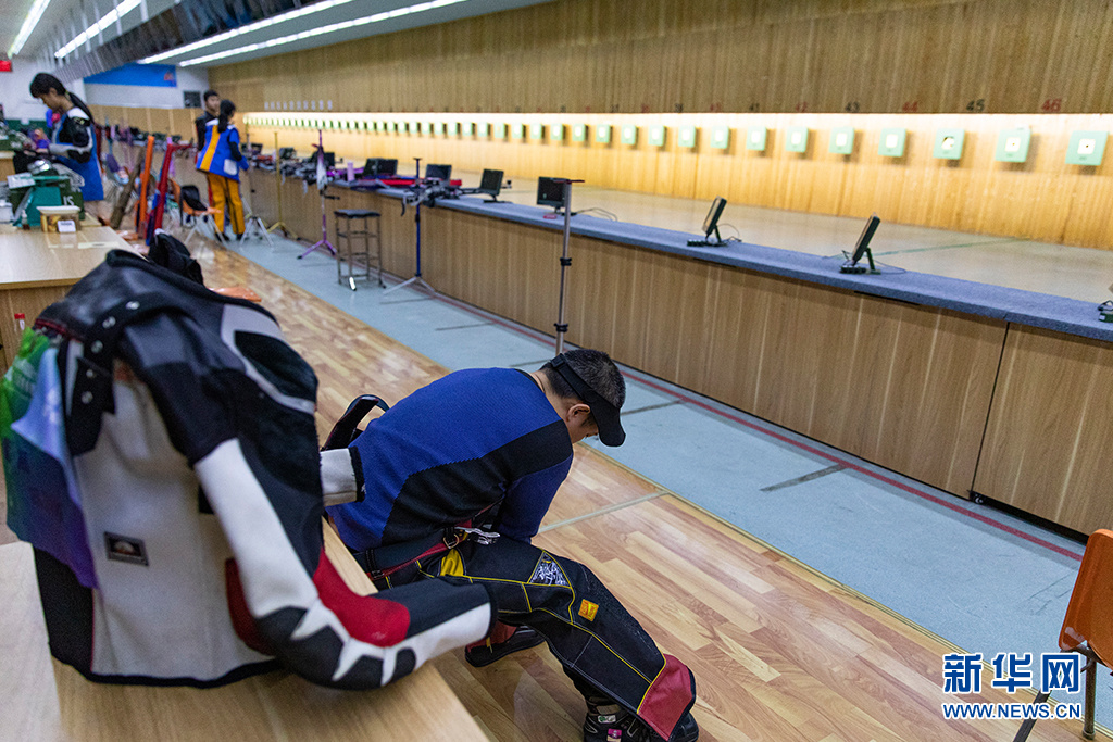 在今年东京奥运会女子10米气步枪决赛中,中国选手杨倩以251.8环拿下首金,这让杨倩和气步枪项目获得了巨大的关注。董超参加的残奥R1-SH1级男子10米气步枪站姿项目,与健全人比赛项目大体相似,但在装备、规则等方面也有很多不同的地方。图为四川省陆上运动学校的10米射击训练馆内,运动员在进行射击训练。新华网 张可凡摄