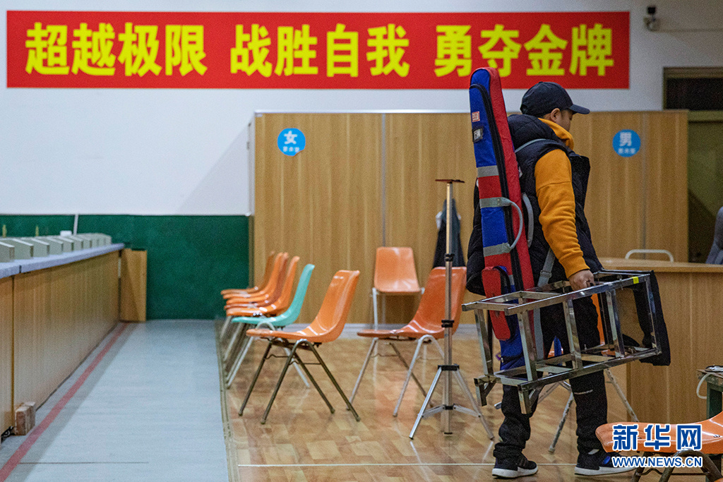 董超训练的主项是R1-SH1级男子10米气步枪站姿,与健全运动员不同,为了站立射击时全身的稳定性,这个项目允许每个残疾运动员用一个“凳子”做支撑。而这个“凳子”的高、低、深、浅细微变化,常常会影响运动员的发挥。图为射击训练结束后,董超将气步枪、“凳子”等及其他配件带离训练场地。新华网 张可凡 摄