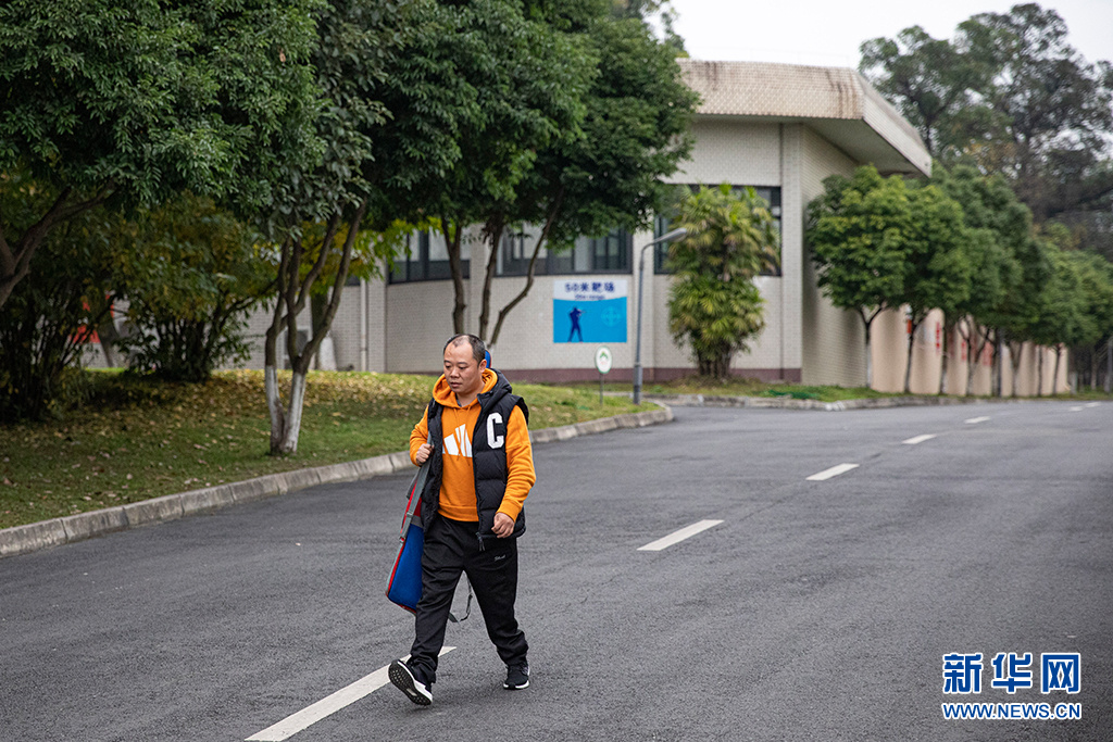 董超平时在四川省陆上运动学校训练,根据安全管理规定,每次练习结束后所有训练用枪都要放回枪库。因此,每天取枪、换射击服、调试枪械、打靶训练、归枪入库的一系列常规动作,构成了他规律的训练生活,不用去现场,你总能知道某个时间点他在做什么。图为董超取完气步枪回射击训练场的路上。新华网 张可凡 摄