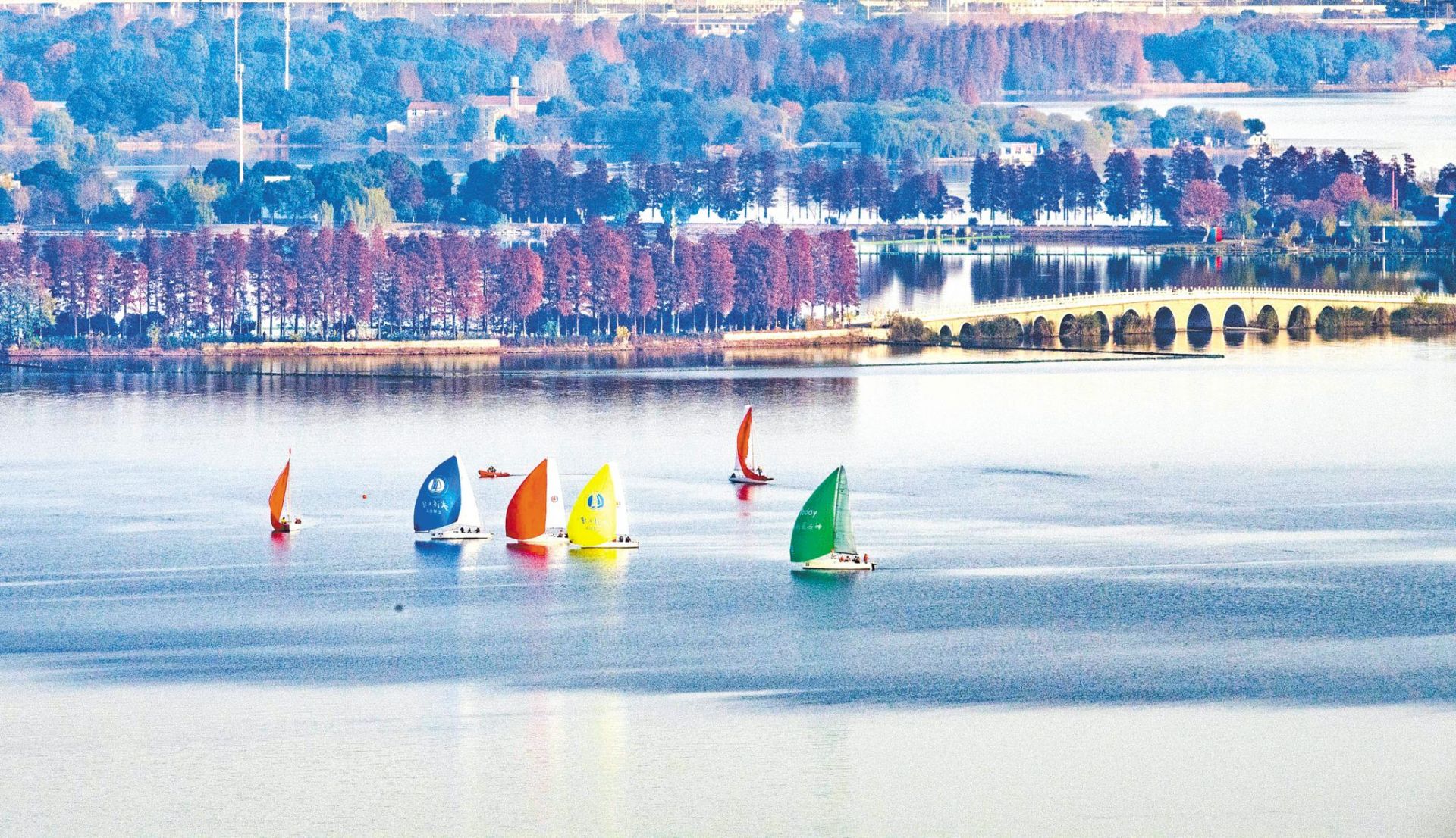 12月1日,武汉东湖风景区空气能见度极高,远处层林尽染的绿道尽收眼底。 (湖北日报全媒记者 魏铼 摄)