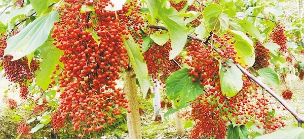 11月底,初冬季节,位于利川市沙溪乡荷花村山桐子示范基地内,一株株山桐子树挂满了鲜红的成熟果实。