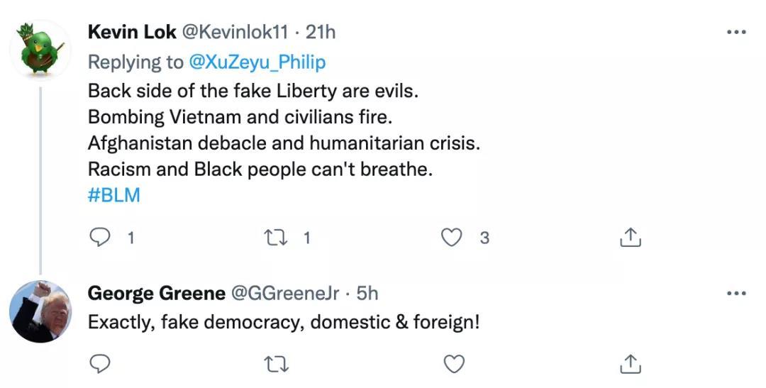 另一个网友立刻回复道:“说的没错,就是假民主,无论在美国国内还是国外都一样。”