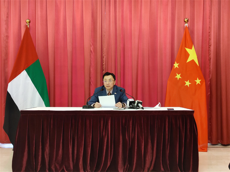 中国驻阿联酋大使倪坚在吹风会上介绍情况。中国驻阿联酋大使馆供图