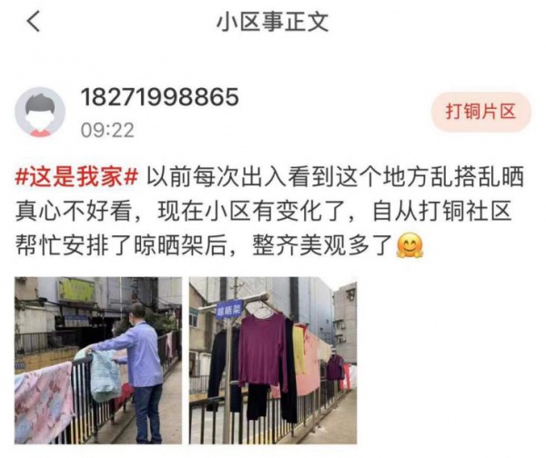 长江日报大武汉客户端12月10日讯(记者吴晓琳 实习生成子栋)12月10日,网友“182*****865”在大武汉客户端“小邻通”版块发帖称赞社区:“以前每次出入看到这个地方乱搭乱晒真心不好看,现在小区有变化了,自从打铜社区帮忙安排了晾晒架后,整齐美观多了。”