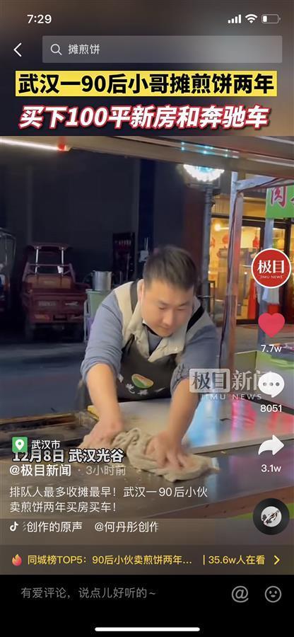 90后小伙杜林峄在武汉光谷一个夜市摆摊,卖煎饼不到两年就实现了买房买车的目标。极目新闻报道此事后,有读者拨打极目新闻热线027-86777777,表示想加盟。此外,还有众多网友在极目新闻官方微信留言,给杜林峄点赞。