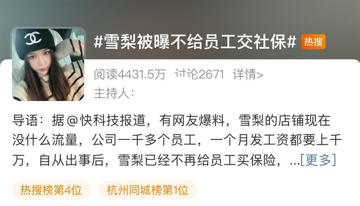10日上午,多家媒体发布微博称,“有网友爆料,雪梨的店铺现在没什么流量,公司一千多个员工,一个月发工资都要上千万。自从出事后,雪梨已经不再给员工买保险,很多人都跑去投诉了。在员工的社保方面,甚至是空白的状态。”