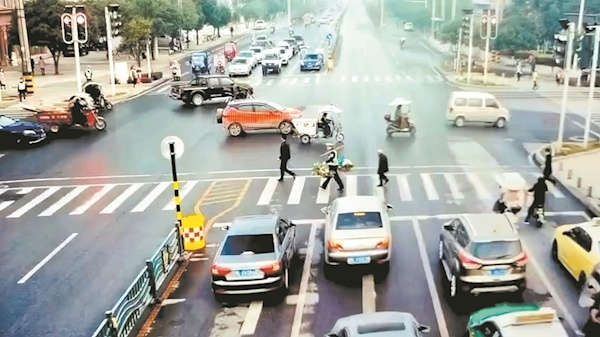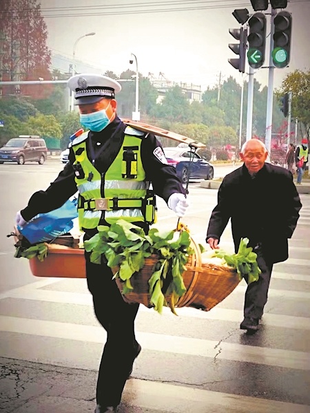 当人行道绿灯亮起,交警挑着扁担,带着老爹爹一前一后通过斑马线。徐晓波随手记录下这一暖心画面,并把照片发到自己的朋友圈。她说,朋友圈里很多人点赞、转发,虽然早上很冷,但是看到这一幕让她心里倍感温暖。