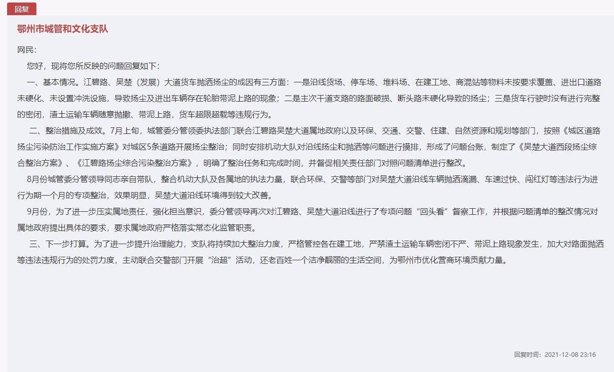 人民网武汉12月12日电 (王郭骥)货车抛洒扬尘、超限超载……今年6月,有网友在人民网“领导留言板”反映湖北鄂州货车运行乱象,希望有关部门加强治理。针对留言,12月8日,鄂州市城管和文化支队回复,已对城区5条道路开展扬尘整治,同时形成问题台账,督促相关责任部门对照问题清单进行整改。