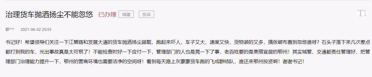 “江碧路和发展大道的货车抛洒扬尘,石头子落下来几次差点都打到我的车。”网友留言称,“老百姓要的是美丽宜居的鄂州,鄂州的营商环境也需要洁净的空间!”