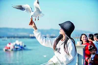 云南昆明,市民在滇池边投喂红嘴鸥。 新华社发