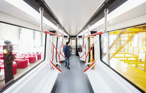 该列车约有两辆公交车长,内部设置如同地铁,可无人自动驾驶。最大载客量为88人,设计最高时速120公里。