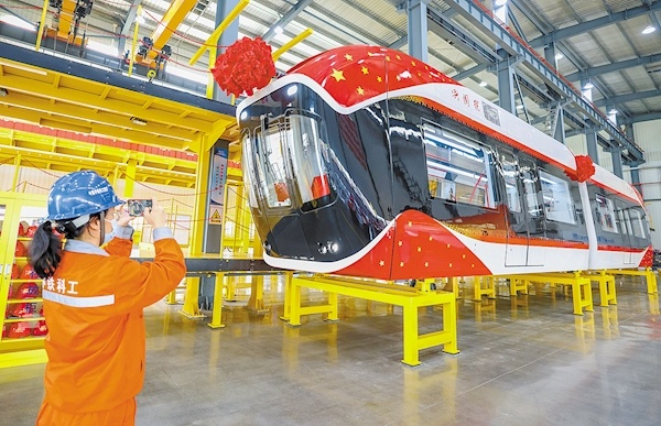 12月14日,国内首辆磁浮空轨车辆“兴国号”在武汉中铁科工集团下线,将用于江西兴国永磁磁浮技术工程示范线。 (湖北日报全媒记者 柯皓 通讯员 潘万齐 摄)