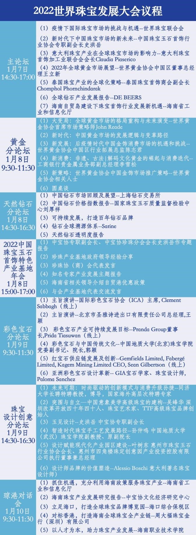 新海南客户端、南海网、南国都市报12月15日消息(记者 王子遥)记者从海口市商务局获悉,2022年世界珠宝发展大会(下称“大会”)将于2022年1月7日-11日在海南国际会展中心举办。大会旨在为珠宝行业讯息交流、资源共享、商贸合作搭建平台,为国内外珠宝产业开展跨国合作提供支持,将设置主论坛、分论坛及平行论坛等环节,其中主论坛将从宏观层面分析全球珠宝行业发展,解读全球珠宝市场的发展新机遇,各个分论坛及平行论坛将在黄金、天然钻石、特色产业基地年会、彩色宝石、珠宝设计创意、琼港珠宝产业对话等细分领域展开深入探讨,在新市场中寻找珠宝产业的外延成长。