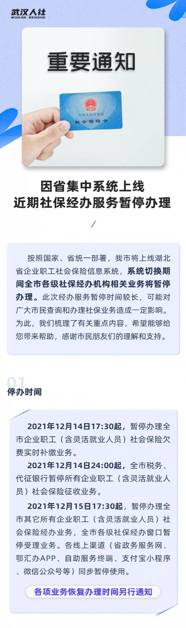 武汉市启用湖北省企业职工社会保险信息系统、恢复办理企业职工社会保险业务的具体时间另行通知。如系统切换进度提前或者延后,将在武汉电视台、武汉市政府网站、武汉市人力资源和社会保障局官网和微信公众号等相关媒体上发布公告,请您及时关注。