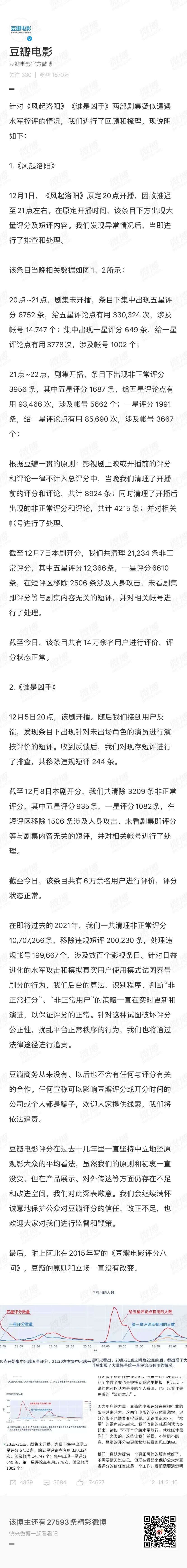 日前,央视发布题为《影视剧遭遇“超前点评” “水军”控评扰乱市场》的报道,指出两部影视剧接连出现“超前点评”的荒诞一幕。12月14日,豆瓣电影官方账号在社交平台上针对《风起洛阳》《谁是凶手》两部剧集疑似遭遇水军控评的情况进行了回应。全文如下: