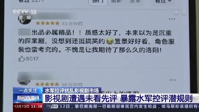 无独有偶,在12月5日首播的某部悬疑网剧中,女主演尚未登场的前两集播出后,网络社交平台上同样准时涌现了大量质疑其演技、台词的论调和一星短评。两部影视剧出现的“超前点评”现象被网友和媒体质疑为“水军”刷分控评。