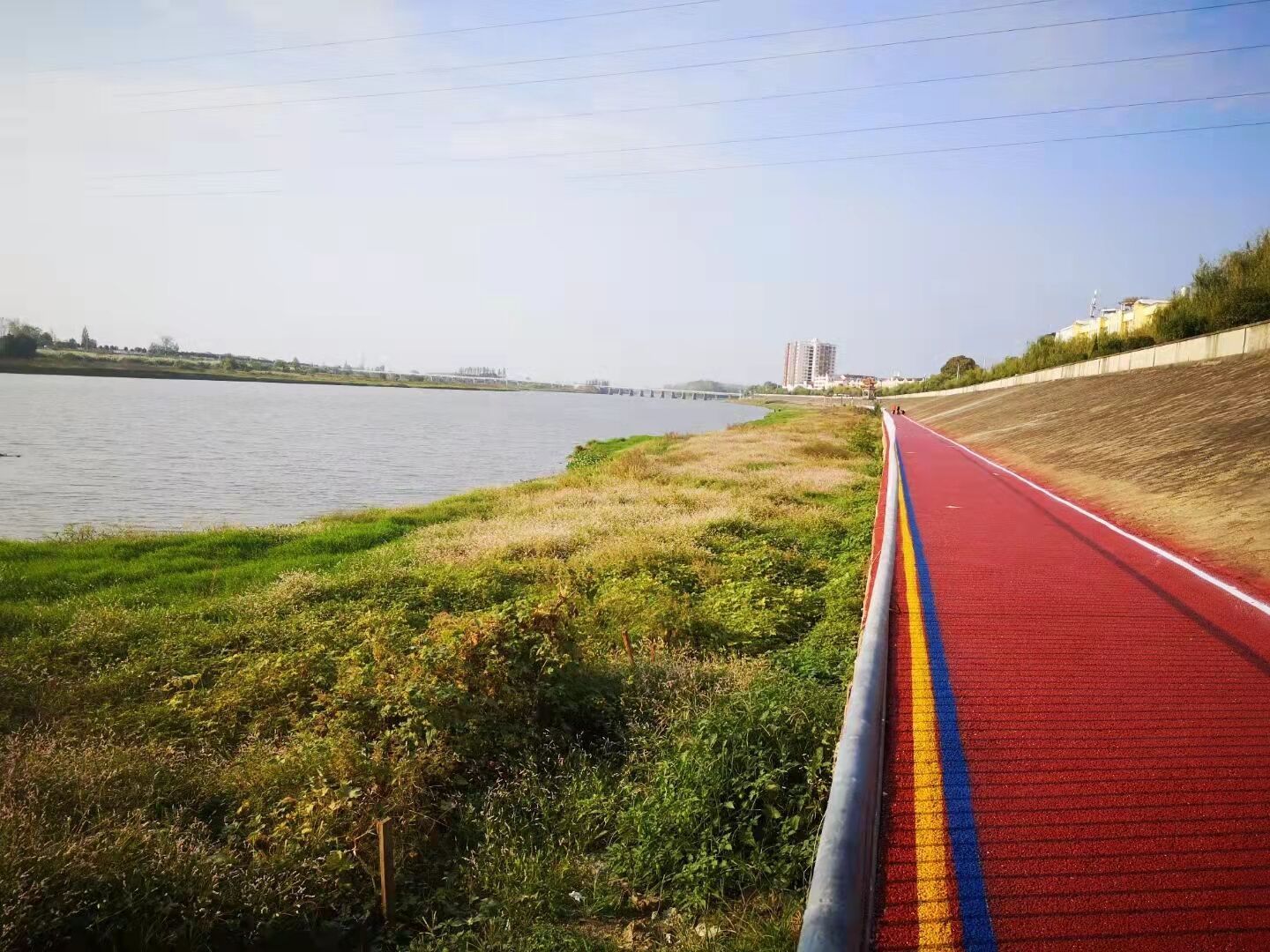 新建设完工的举水河橡胶坝健身步道位于举水河东岸,南起抗洪纪念亭,北至老大桥,宽约3米,全长1075米。整个步道采用特种彩色透水混凝土工艺施工。这条彩色荧光步道,色泽艳丽,标线清晰,点缀的荧光颗粒,不仅增加了步道颜值,夜间发光还有指引效果,现已成为邾城地区居民健身休闲的好去处。