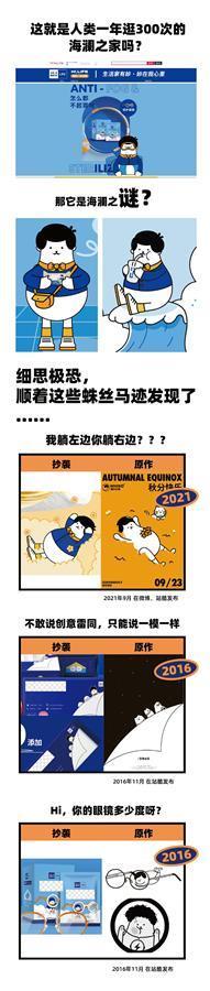 WHIKO谜之生物品牌工作人员向记者提供了截图证据,图片显示,海澜之家生活家产品的包装插画上,“小海”的动作姿势等与WHIKO谜之生物的多个作品雷同。有不少网友评论“这一看简直一模一样。”“维护和支持原创。”