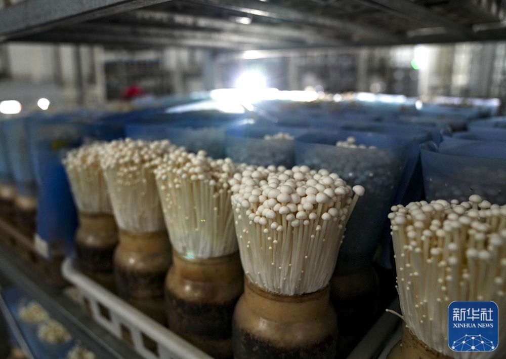 12月15日,在位于丛林镇绿水村的现代化农业智能工厂的恒温恒湿生产车间内,金针菇在智能设备的“照料”下快速生长。新华社记者 刘潺 摄