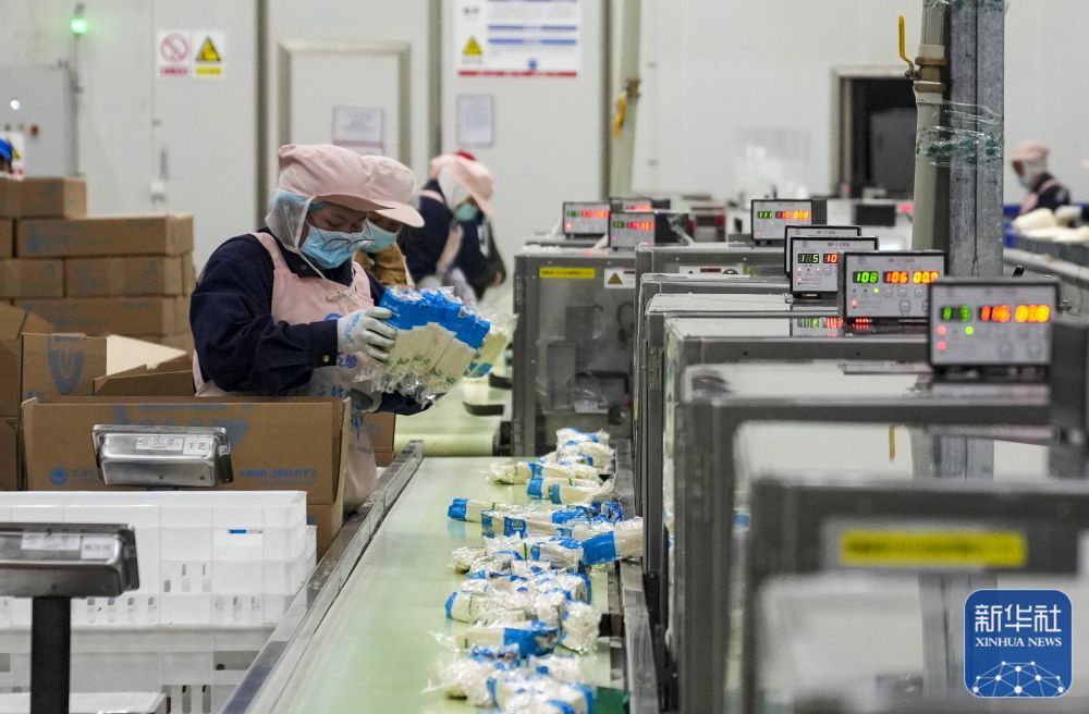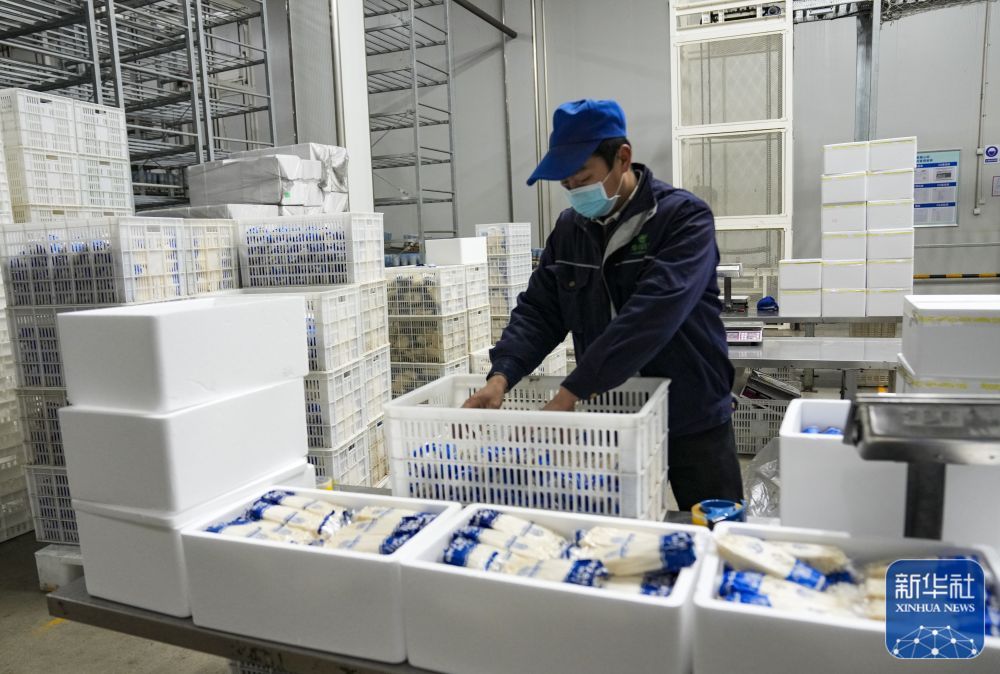 12月15日,在位于丛林镇绿水村的现代化农业智能工厂内,工人在按照客户的订单要求对金针菇产品进行分包装箱。新华社记者 刘潺 摄