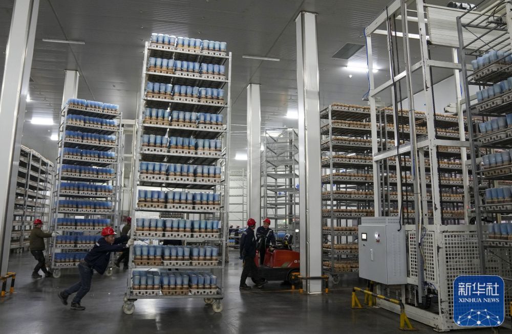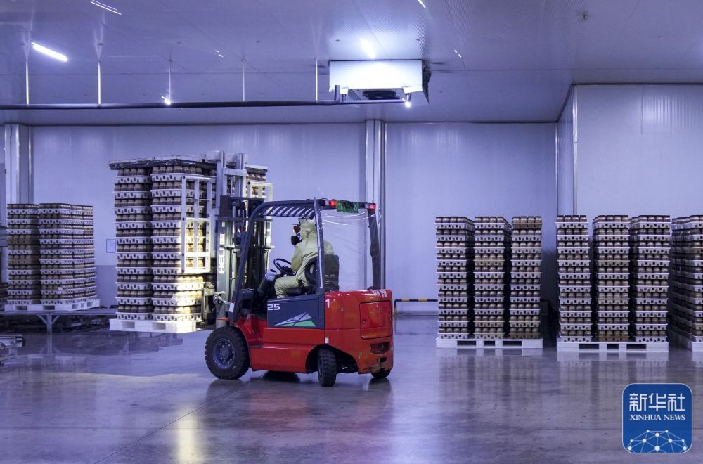 12月15日,丛林镇绿水村重庆华绿生物有限公司现代化农业智能工厂的培养室内,工人在操作叉车转运金针菇种植罐到指定位置进行生产。新华社记者 刘潺 摄