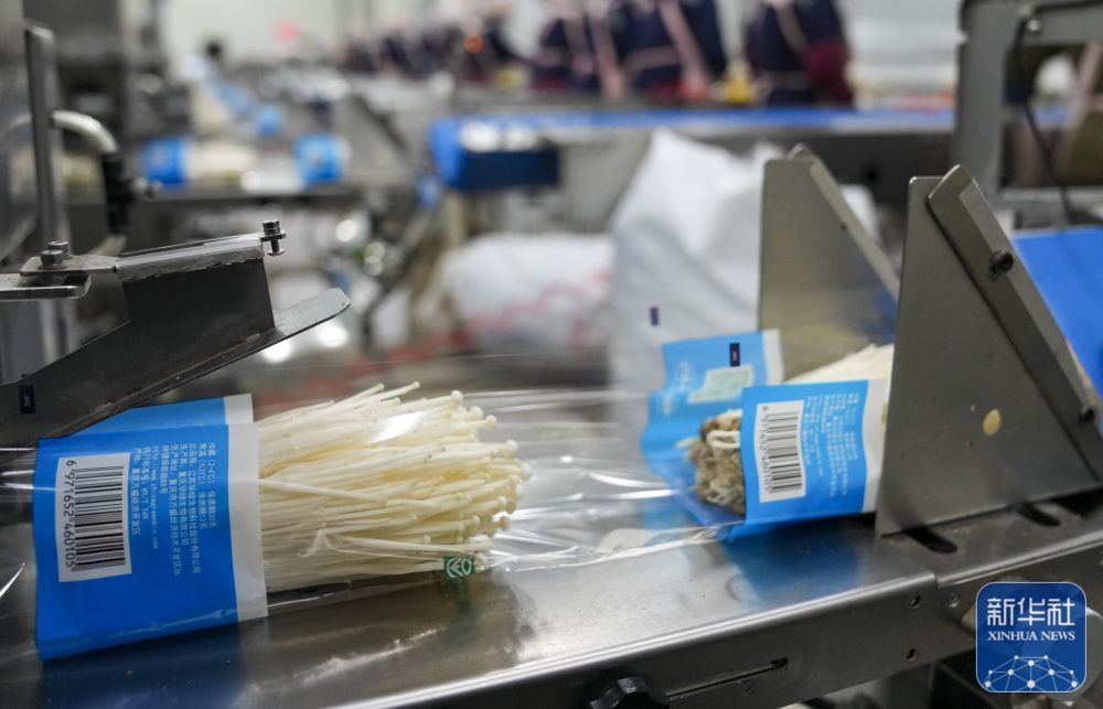 12月15日,在位于丛林镇绿水村的现代化农业智能工厂内,刚刚采收的金针菇在流水线上分包过秤。新华社记者 刘潺 摄