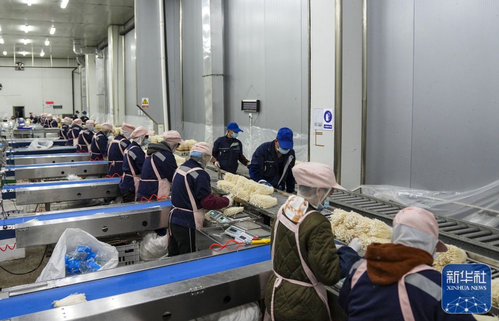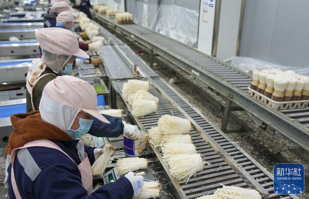 12月15日,在位于丛林镇绿水村的现代化农业智能工厂内,工人在流水线上采收金针菇。新华社记者 刘潺 摄