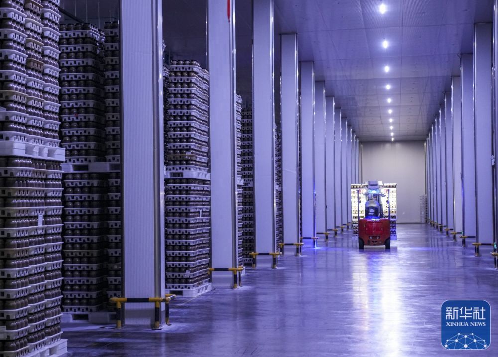 12月15日,在位于丛林镇绿水村的现代化农业智能工厂内,工人操作叉车转运制备好的金针菇种植罐。新华社记者 刘潺 摄
