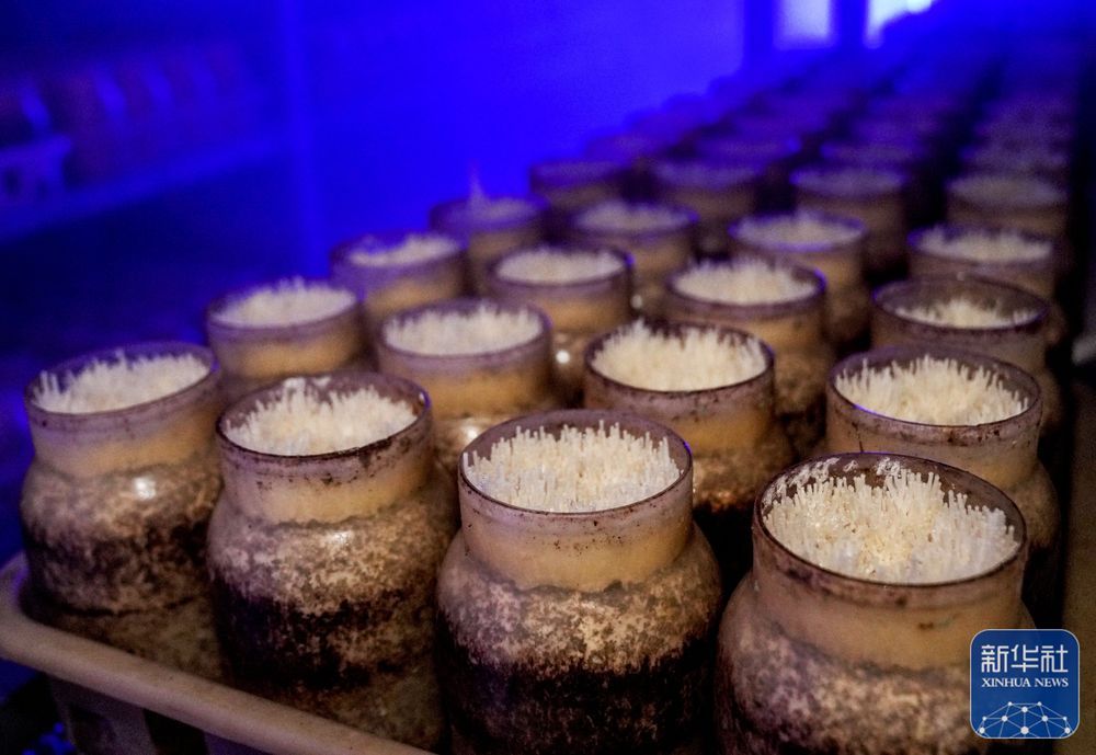 12月15日拍摄的丛林镇绿水村重庆华绿生物有限公司现代化农业智能工厂生产的金针菇。新华社记者 刘潺 摄