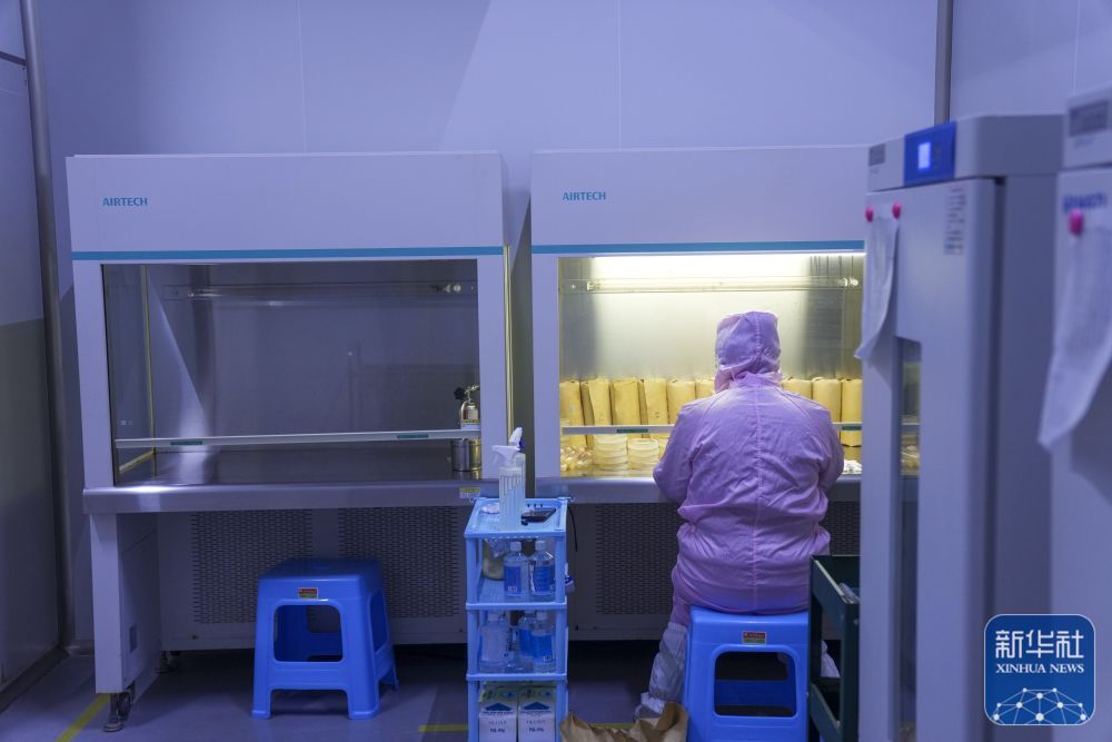12月15日,在位于丛林镇绿水村的现代化农业智能工厂内,一名技术工人在进行金针菇菌种的转接和培养。新华社记者 刘潺 摄