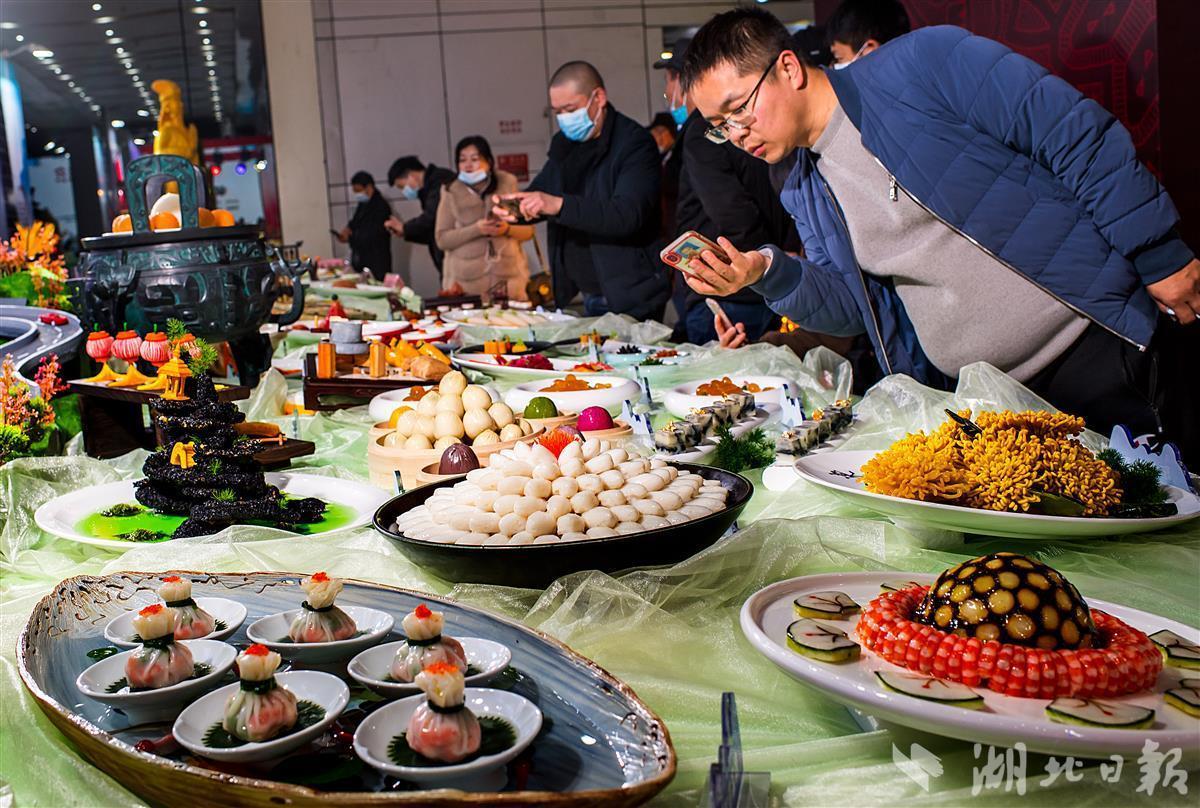 “名厨名菜展”的展台上,龙眼鱼糕、荔枝鮰鱼、珊瑚鳜鱼、天养素毛肚……一桌丰盛的菜肴各具湖北地方特色,这些作品出自百余名楚菜大师之手。