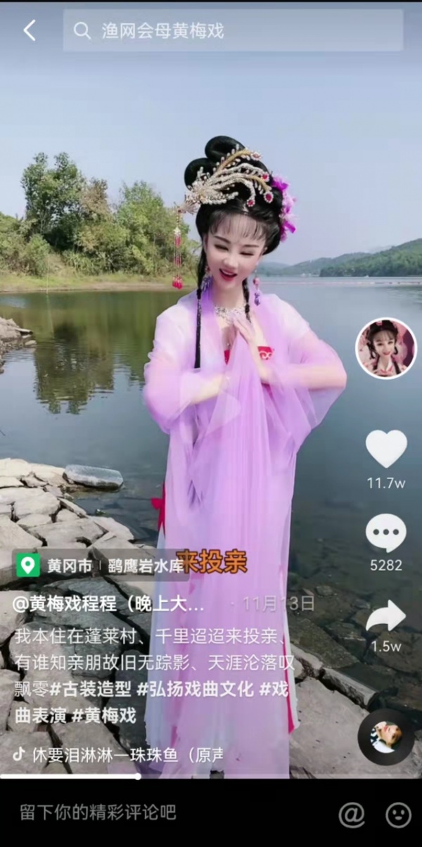 对程程而言,抖音成了一个更大的舞台。比如,她分享的一段在湖边唱戏的视频,就有20万人点赞;每天的直播,不仅能吸引戏曲爱好者,还发展了不少新粉丝。