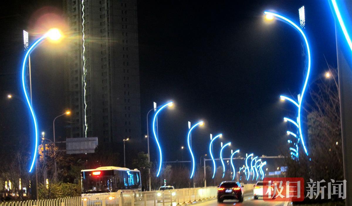 12月16日晚,武汉市东西湖区金银湖环湖路,婀娜多姿的蓝色路灯成为一道靓丽的夜景。据了解,武汉市东西湖区吴家山环山路、四明路等多个路段出现这种婀娜多姿的蓝色路灯,使夜色呈现出魔幻色彩,扮靓了城市夜景。