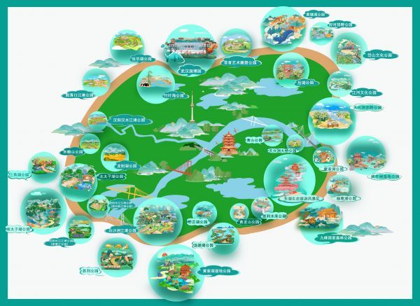 在启动三环线生态带建设的同时,武汉利用沿线丰富的山水林田湖等自然资源,持续打造“一环串多珠”式的环带公园群,以期为市民提供更多游憩的绿色公共空间,使绿环不仅可以“看”,还可以“玩”。