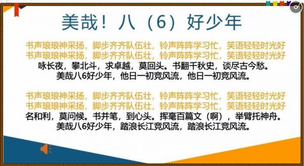2017级七(6)班的同学们升入八年级后,将个性班名由原来的“启航班”改为“扬帆班”,并以《美哉!八(6)好少年》为曲名,重新填词,反复试唱修改,最终定为班歌。“歌词中的‘咏长夜,攀北斗,求卓越,莫回头,书翻千秋史,谈尽古今愁’与‘扬帆’主题相契合,唱起来也朗朗上口,深受同学们的喜欢。”沈儒瑄同学说。
