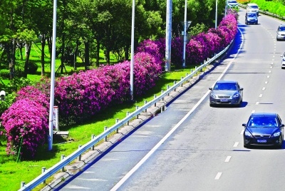 为保证行车视线通透,三环线整体绿化比较简洁。但为防止驾驶员视觉疲劳,不同路段的绿化形式也需要局部形成变化。三环线上主要种植有月季、紫薇、夹竹桃、木芙蓉等开花植物品种,大多易于养护,花期较长。春夏秋三季,91公里环线的重要节点部位,月月开花不断档,给路上的司机、乘客带来美的享受。