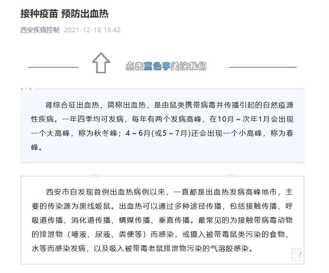 18日当天,西安疾控中心以及多家当地医院发布了“防治出血热”的相关文章,提醒市民做好预防,并及早介入治疗。