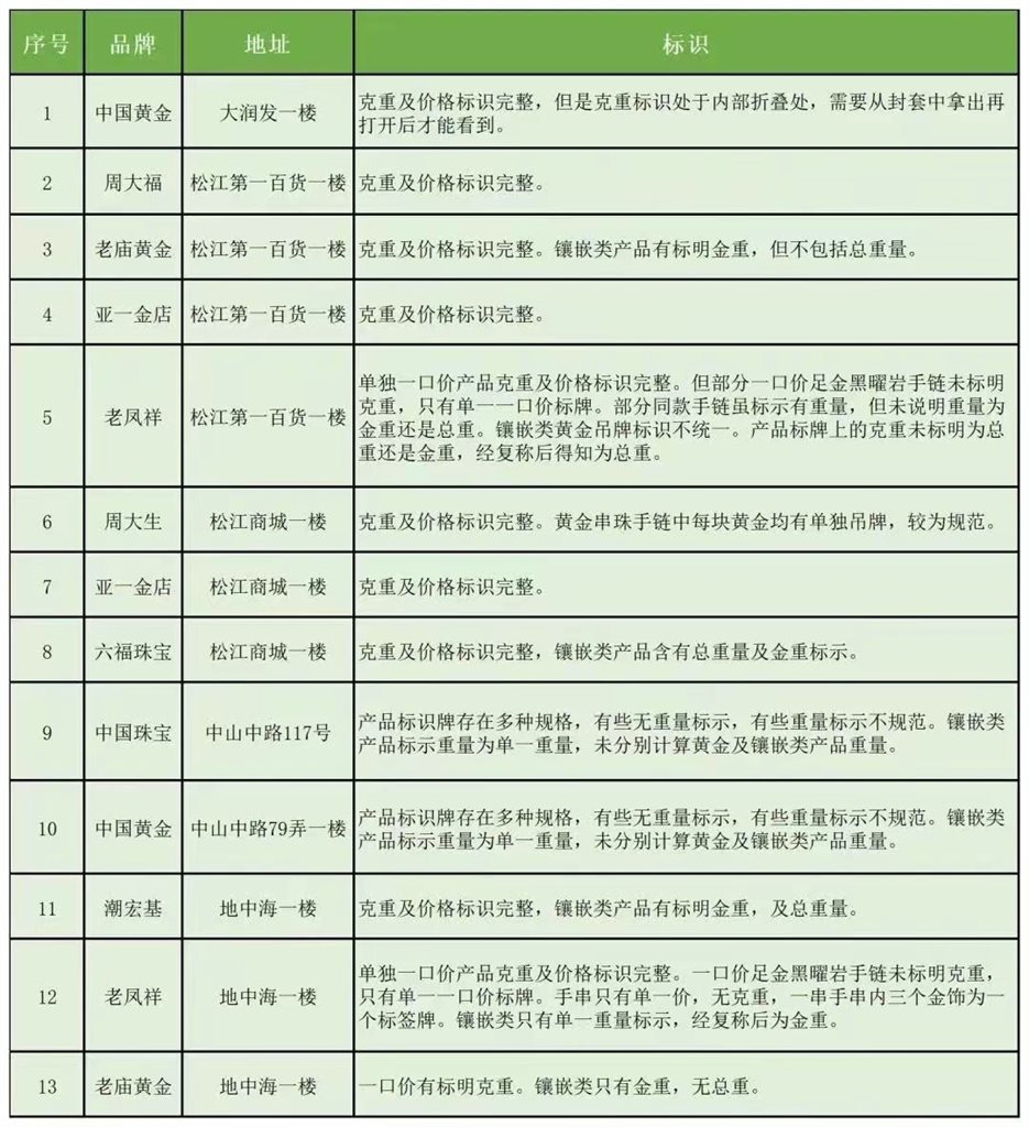 根据上海市地方标准《金银饰品标识规定》,在上海市内进行生产、销售的金银饰品类产品,有责任与义务在销售标签牌上标识出产品重量(g)。松江区消保委对辖区内13家黄金珠宝店开展相关调查,涉及中国黄金、周大福、老庙黄金等品牌。