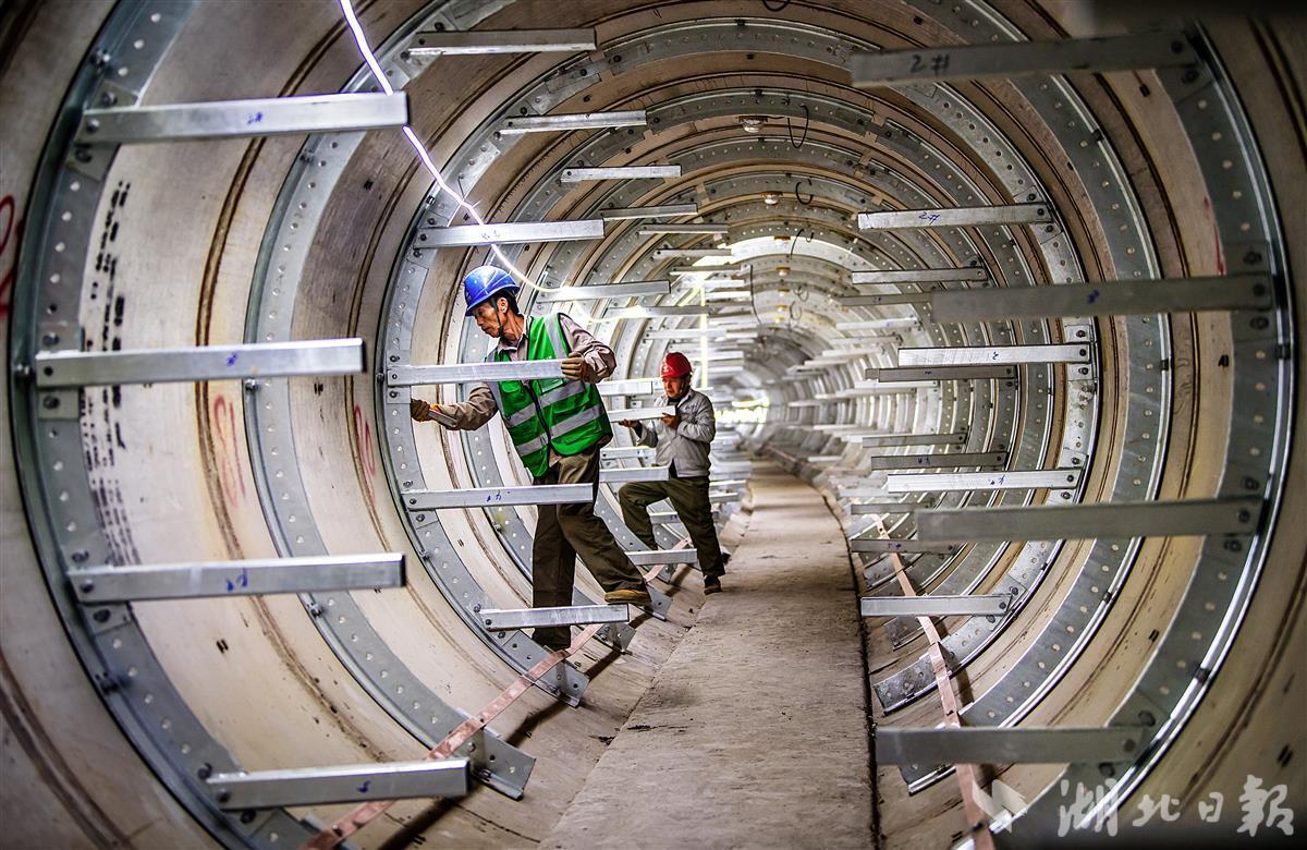 12月20日,武汉市东西湖金银湖底隧道内,施工人员正在安装电缆架。