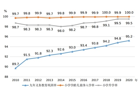 2010—2020年九年义务教育巩固率、小学学龄儿童净入学率和小学升学率。图片来源:国家统计局网站。