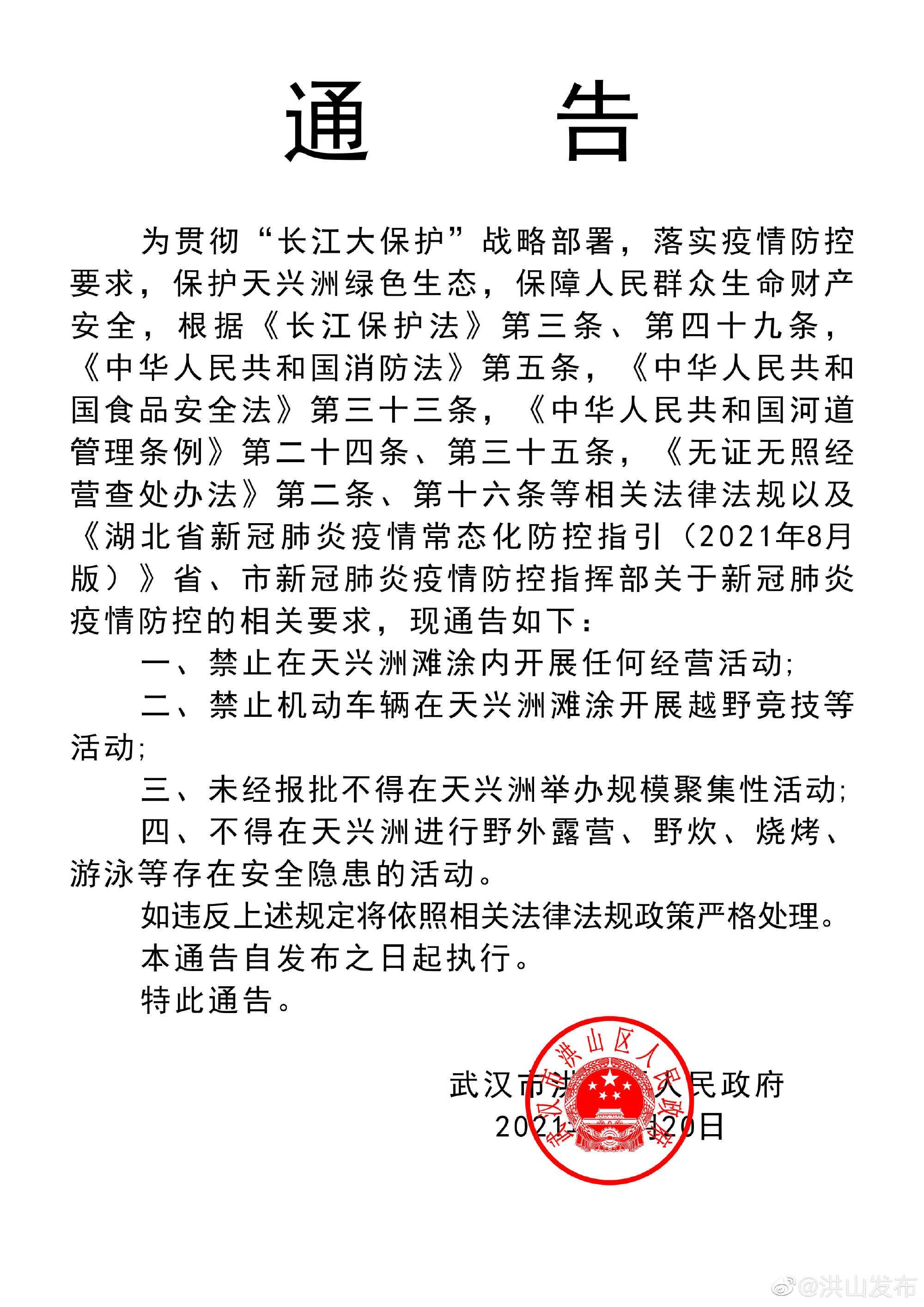 长江日报大武汉客户端12月21日讯(记者汪峥) 长江日报记者从洪山区获悉,20日,洪山区人民政府发布公告称,根据《长江保护法》《中华人民共和国河道管理条例》等相关法律法规及疫情防控要求,天兴洲滩涂内禁止开展经营性行为,机动车越野竞技、野外露营、野炊烧烤等行为也被列入禁止范围。