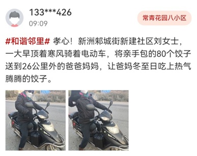 长江日报大武汉客户端12月21日讯 “孝心!新洲邾城新建社区刘女士,一大早顶着寒风骑着电动车,将亲手包的80个饺子送给26公里外的爸爸妈妈。”12月21日,网友“133***426”在“小邻通”发布的一条帖子,获得众人点赞。