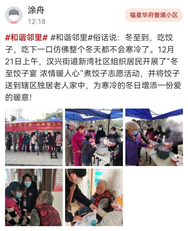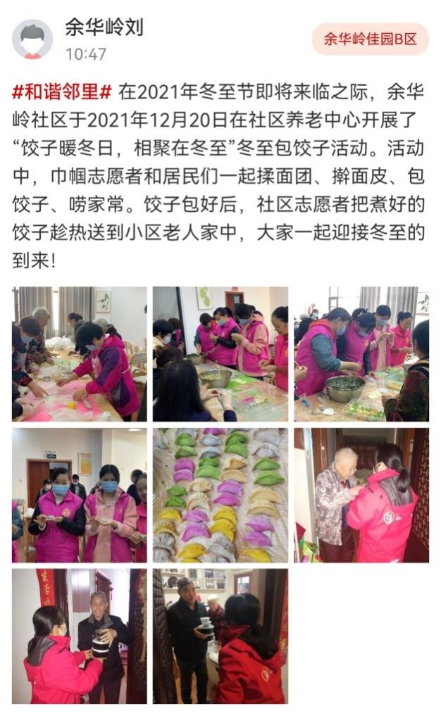 余华岭社区在社区养老中心开展了“饺子暖冬日,相聚在冬至”冬至包饺子活动,和居民们一起唠家常,把煮好的饺子送到老人家中,一起迎接冬至的到来。